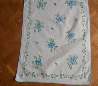 Torchon fleurs bleues, sur fond blanc, coins arrondis, tour gansé d'un ruban bleu assorti, petits motifs dans le tissu. Dimensions : 55 cm x 76 cm. Très bon état. A récu