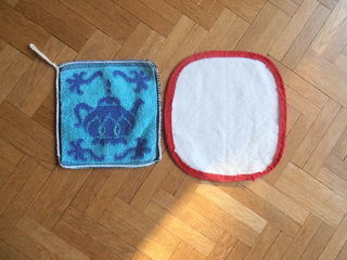 Lot de 2 maniques : - bleue en tissu éponge : 16 cm x 16 cm, - blanche avec tour rouge : 18,5 cm x 20 cm. Excellent état. A récupérer sur place ou possibilité d'envoi à vos