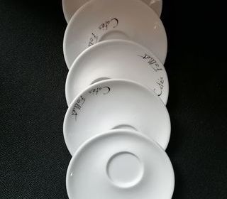 Lot de CINQ Sous Tasses à Café Marque : "FOLLIET" (Torréfacteur) By "Cup & Saucer" Portugal Avec emplacement de la Tasse à Café Ø 12cms