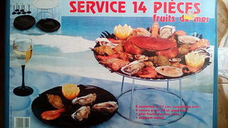 SERVICE A FRUITS DE MER NEUF COMPRENANT 14 PIECES : - 6 ASSIETTES DIAMETRE 27 CM COQUILLAGE NOIR - 6 VERRES A VIN -1 PLAT FRUITS DE MER INOX - 1 SUPPORT METAL CONTACT