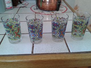 A vendre 4 verres à thé vintage neufs (jamais servis) REIMS FR. 2 couleur bleue 2 couleurs verte. Contenance 9cl. Hauteur : 8.5cms. Diamètre : 5cms. Prix : 8 euros Visibles s