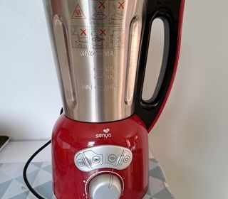 Blender rouge et acier inoxydable, marque Senya, équipé de commandes digitales et d'un cadran pour régler la vitesse. Doté d'une grande cuve graduée avec indicateur de capacité max