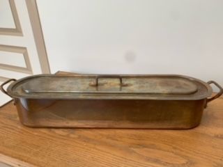 Poissonnière double métaux à utiliser en cuisine ou en déco Extérieur possiblement alliage cuivre/laiton ? Intérieur type fer blanc Bon état général, poignées à revernir A retir