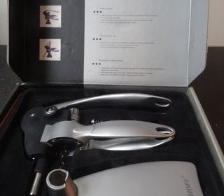 Tire-bouchon de marque BergHoff. Très peu servi. Dans sa boîte en carton. Livré avec support et 2 mèches. Caractéristiques : - Extrait le bouchon en 4 secondes - Libère le