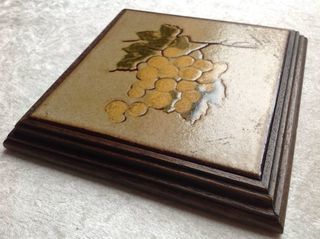 DESSOUS DE PLAT ANCIEN BOIS ET CÉRAMIQUE RAISIN Envoi possible ANCIEN DESSOUS DE PLAT EN BOIS ET CÉRAMIQUE AU MOTIF DE GRAPPE DE RAISIN DE 18,4 cm DE CÔTÉ ET 2,5 cm DE HAUT.