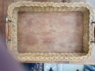 Je vends ce joli plateau de service en osier tressé de couleur beige avec des poignées en laiton et bois avec un fond en bois. - Type de produit : Plateau de service 25 cm X 38 cm