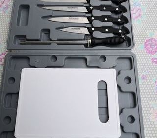 Malette en plastique gris contenant un assortiment de 5 couteaux de cuisine, un aiguiseur et une petite planche à découper en plastique blanc..
