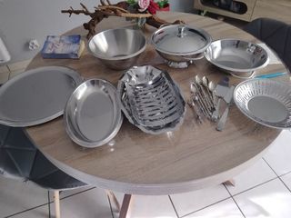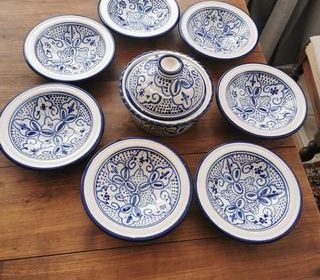 Je vends ce service de vaisselle en céramique bleue de la marque Poterie Slama. - Type de produit : Service de vaisselle en céramique avec une cocotte avec couvercle et 7 assiette