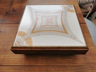 Je vends ce dessous de plat en céramique aux motifs géométriques dorés et beiges. - Type de produit : Dessous de plat - Matière : Céramique - Motif : Géométrique avec rayons dor