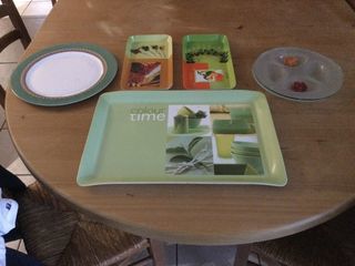 Lot composé de - 1 grand plateau - Dimension en cm 47x32 - 2 petits plateaux - Dimensions en cm 31x16 - 1 dessous de plat décoratif en verre - Diamètre 26cm - 1 plat de serv