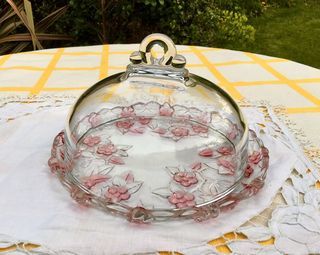 Expédition possible. Opportunité : Belle ancienne cloche à fromage ou à pâtisserie ? avec son plat de présentation. En verre épais (8mm) de qualité, motifs floraux en relief e