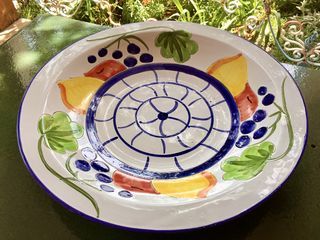 Expédition possible. Grand plat provençal neuf (jamais utilisé). Pièce artisanale: terre cuite émaillée et peinte à la main. Dimensions : - Diamètre : 39,5 cm - Hauteur : 6 cm
