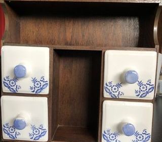 Étagère à épices en très bonne état 10 tiroirs en céramiques. 4 grands tiroirs. 6 petits tiroirs. Partie bois en bonne état. A prendre sur place.