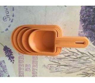 ***D08 - Grandes Cuillers mesures Tupperware orange (5) TBE, quasi-neuves Des mesures simples et rapides 50 ml, 100 ml, 150 ml, 200 ml, 250 ml Permettent de mesurer et de puiser