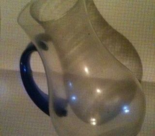 Pichet en verre avec anse bleue, 20 cm environ de haut, TBE FAIRE OFFRE Annonce de Capestrine. Pour info je vends la totalité de ce que je possède avant départ alors j'ai peut-