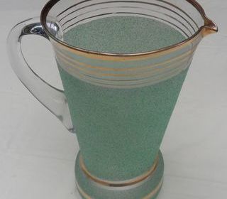 Grande Carafe verte en verre dépoli - Hauteur 26 cm Diamètre de la bouche 15 cm et de la base 12 cm Dimension du bec verseur au bout de la poignée 22 cm Contenance environ plus