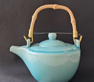théière en céramique émaillée bleu turquoise avec anse en bambou hauteur sans couvercle 8 cm hauteur avec couvercle 12 cm hauteur avec anse 17 cm longueur avec bec 15 cm di