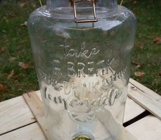 hauteur totale 27 cm en verre, inscription : take a break drink lemonade ouvrir le dessus pour que la boisson coule Remise en main propre possible sur Paris A LIRE : 95250 =
