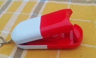 Porte-clés : Coupe médicament simple avec son compartiment de rangement (Pilulier de poche)... pour les voyages, usage quotidien, etc... * Gagnez du temps et des efforts avec ce