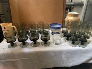 Vends, 8 Flutes a champagne, 7 verres avec anse, 3 verres a eau , 1 verre a vin 1 verre a chivas Prix 15 € 1 bol sur pieds 4 € 1 pichet Jameson 8 € 1 pot en grès 7€ L'ensemble