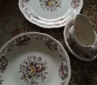 service à vaisselle anglais complet en très bon état : assiettes plates, creuses, saladier, soupière, 2 raviers, saucier, plats creux, plat...