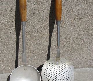 Ancienne louche et écumoire - années 1940 en alu avec manche en bois et crochet à l'arrière estampillée d'un trèfle SFMO pour la louche Longueur de la louche : 39 cm Longueur d