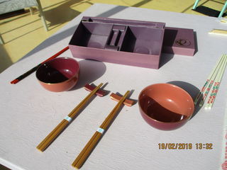 Lot Ensemble Neuf : - Couleur violet et vieux rose avec une bordure dorée. - 2 bols : diamètre 23 cm - 4 baguettes : 23 cm - 2 supports baguettes : 6.5 cm - Dans boite cade