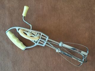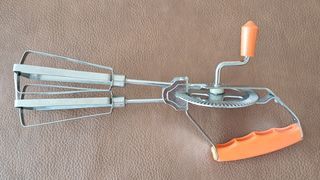 batteur fouet à pâtisserie manuel à main vintage en inox et plastique orange longueur totale 26 cm longueur des fouets 8 cm en parfait etat de marche, peut aussi bien servi