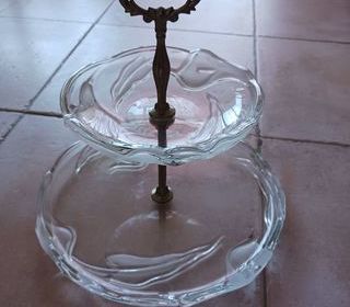 Vends présentoir à apéritifs .Les plateaux sont en verre et font 17 et 26 cm de diamètre, la tige est en metal argenté. La hauteur totale du présentoir est de 27 cm Prix 15 € En