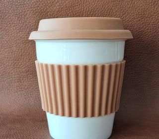 tasse mug thé café en céramique avec couvercle et protection contre le chaud en silicone marron neuf hauteur 12 cm diamètre 9 cm