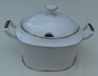 Soupière neuve vintage avec un couvercle et une encoche dans celui-ci pour passer un ustensile (cuillère non fournie) en porcelaine de Bavière de Schirnding blanche ornée d'un file