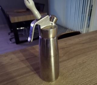 Siphon à crème en acier inoxydable avec levier à main, finition brossée. Accessoire inclus pour appliquer la crème. Marque visible : "MAX".