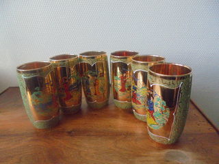 6 verres a motif chinois , sur verre colorer 12 cm de haut chaque verre a un motif différent