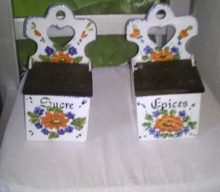 Pot à épices boîte mural Porcelaine motif de fleurs Excellent etat 1 pour sucre 1 pour épices Avec clavier bois remontante 11 cm de long 20 cm de haut Envoie dans