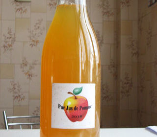 Pur jus de pomme, sans additif, filtré et pasteurisé, (peu de dépôt et conservation de plusieurs années). Issu de vergers non fertilisés et non traités par les pesticides. Bouteill