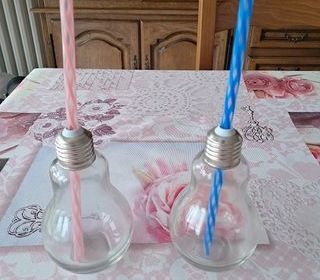 Bonjour, Je vous propose depuis mon armoire, * Duo de verre en forme d'ampoule, H : 13cm, D : 4cm chacun accompagné de leur paille. Neuf, maison non fumeur. Tarif pour