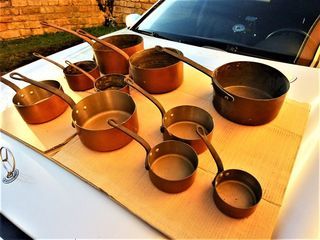 Superbe série de 10 poilons anciens Dame Jeanne. En cuivre étamé, poignées métal Pourraient convenir à cuisinier professionnel Découverts dans un grenier, dans l'état de découve
