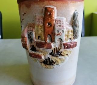 Brique à vin ? Terre cuite ? surimpression en terre d'un village ? H 23 cm Prix 20 €