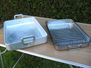 LOUE 2 grands plats à rôtir - 1/ de professionnel en alu, très épais : 41 cm x 33 cm x 7 cm, avec anses - 2/ en inox avec grille et anses : 41.5 cm x 31 cm x 6 cm propres et en
