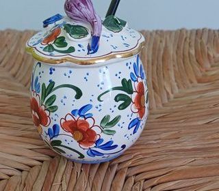 Moutardier ancien Hauteur du pot : 6,5 cm (7 cm avec le couvercle). Diamètre ouverture : 5cm. Motif peint à la main. Petite cuillère en plastique. Très bon état.