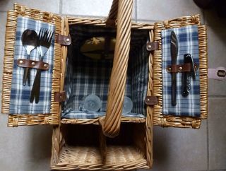 vintage, panier pique-nique en osier, rectangulaire, pour 2 personnes (assiettes, couverts, flutes, tire-bouchon), grande anse, emplacements pour bouteilles, jamais utilisé.