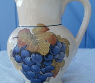 Un pichet en faïence. C'est une poterie artisanale de Didier Blanchardon. D'un côté, il y a un décor représentant une grappe de raisin et de l'autre, le nom de Beaune. Le pot