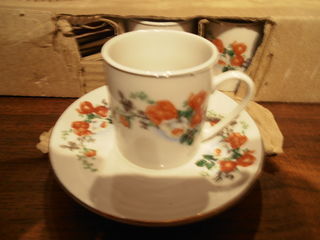 6 tasses et 6 soucoupes en porcelaine ; motif fleur et liseré doré . prix 3€ ; Tél : 05 65 60 46 61 .