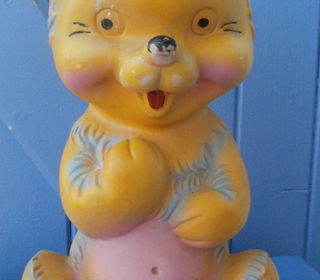 Ancien ourson des années 60 POUET POUET IL fonctionne en lui appuyant sur le ventre Hauteur 28 cm J'ai commencé à le nettoyer mais je n'ai pas voulu frotter (peur de l'abimer)
