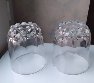 e Vends un lot de 2 verres blancs transparents, larges, très anciens, non ébréchés. Hauteur : 9 cm Diamètre ouverture : 8 cm