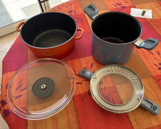 Lot de 1 cocotte et un faitout encore fonctionnel malgré traces d'usure bien visibles sur les photos. Le couvercle en verre est abîmé vers l'intérieur mais reste utilisable.