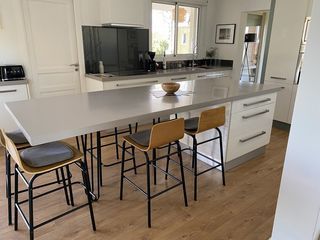 Îlot de cuisine avec 1meuble de rangement 3 tiroirs de chaque côté donc rangement couverts Plateau en Corian gris clair très facile d entretien meuble laqué blanc Et 6 chaises