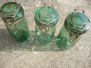 Vends ,"dans leur jus" pour conserves ou décoration 3 bocaux très anciens "l'idéale" - contenance 1l -