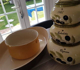 Vends set, ail échalote oignon, +2 plats à gratin + service à café 15 pièces +6 verres à Perrier, 6 grands verres à eau, 8 coupes pour glace ou fruits + set 3 pièces pour salle de