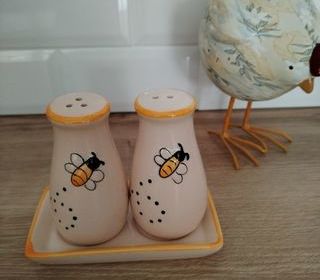 Salière et poivrière de 8,5 cm Avec support en céramique 11,5 cm de Longueur et 6,5 cm de largeur Motif abeille ? Joli déco dans votre cuisine